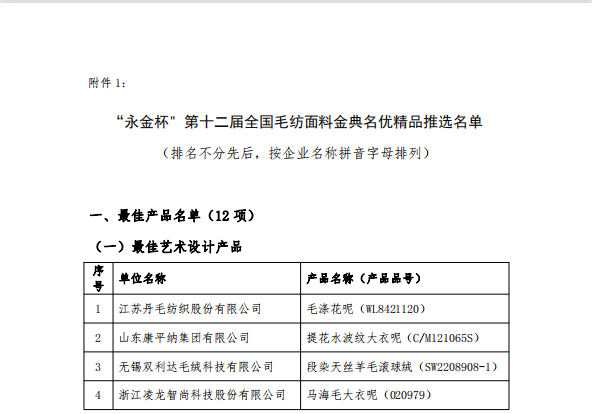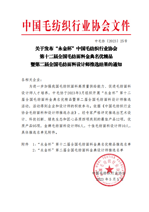 近日,在中國毛紡織行業(yè)協(xié)會組織開展的“永金杯”第十二屆全國毛紡面料金典名優(yōu)精品暨第二屆全國毛紡面料設計師推選活動中,山東康平納集團有限公司推選的毛紡面料-榮獲“永金杯”--最佳藝術設計產(chǎn)品獎及匠心品質產(chǎn)品獎”。